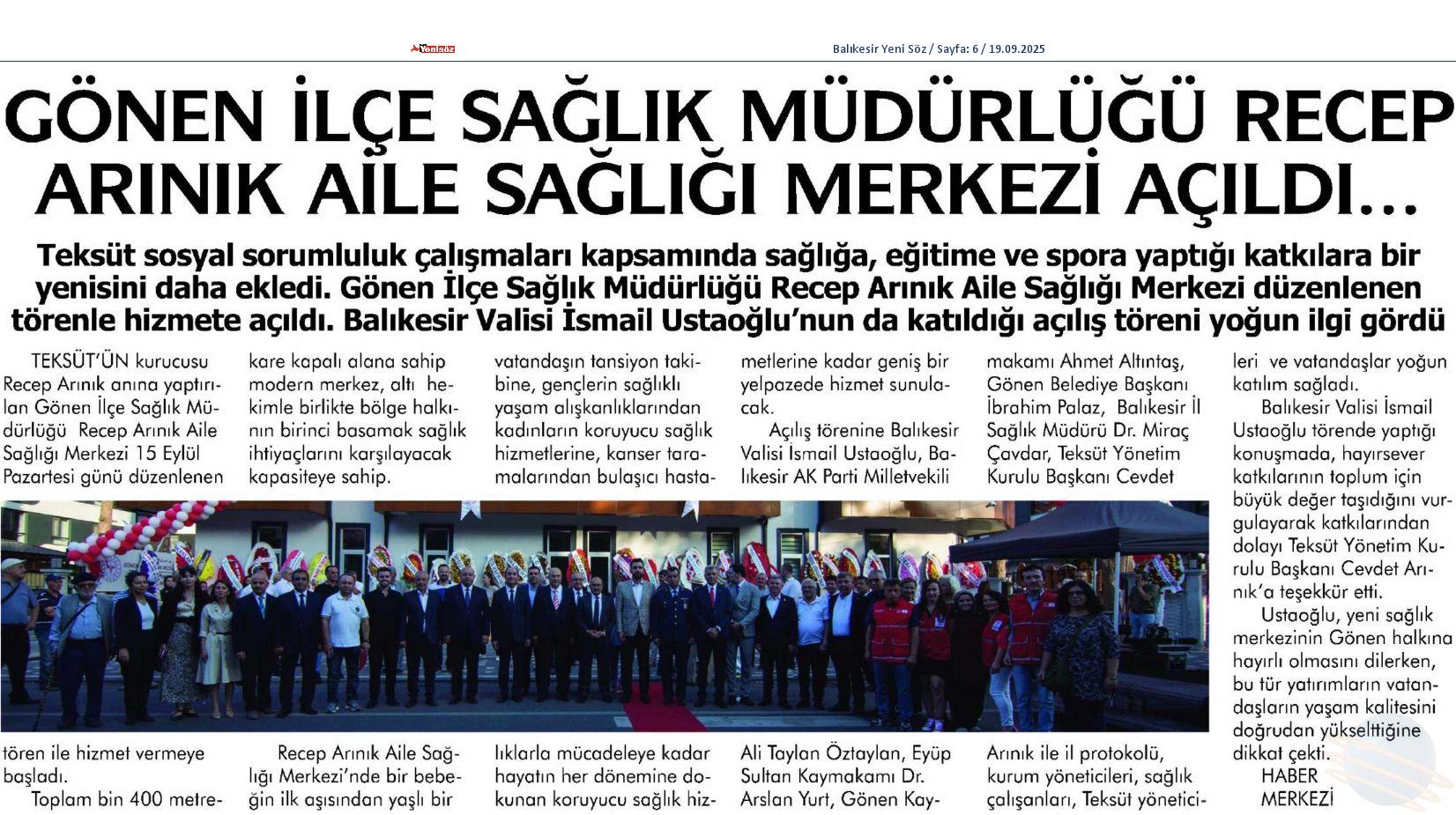 Gönen İlçe Sağlık Müdürlüğü Recep Arınık Aile Sağlığı Merkezi açıldı