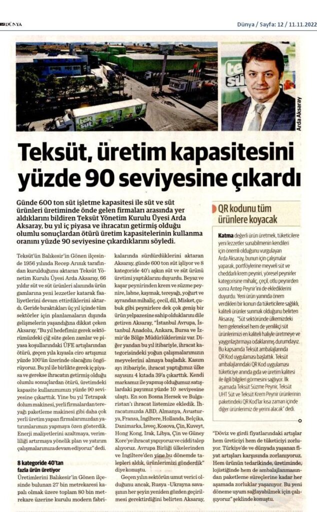 Teksüt, üretim kapasitesini yüzde 90 seviyesine çıkardı